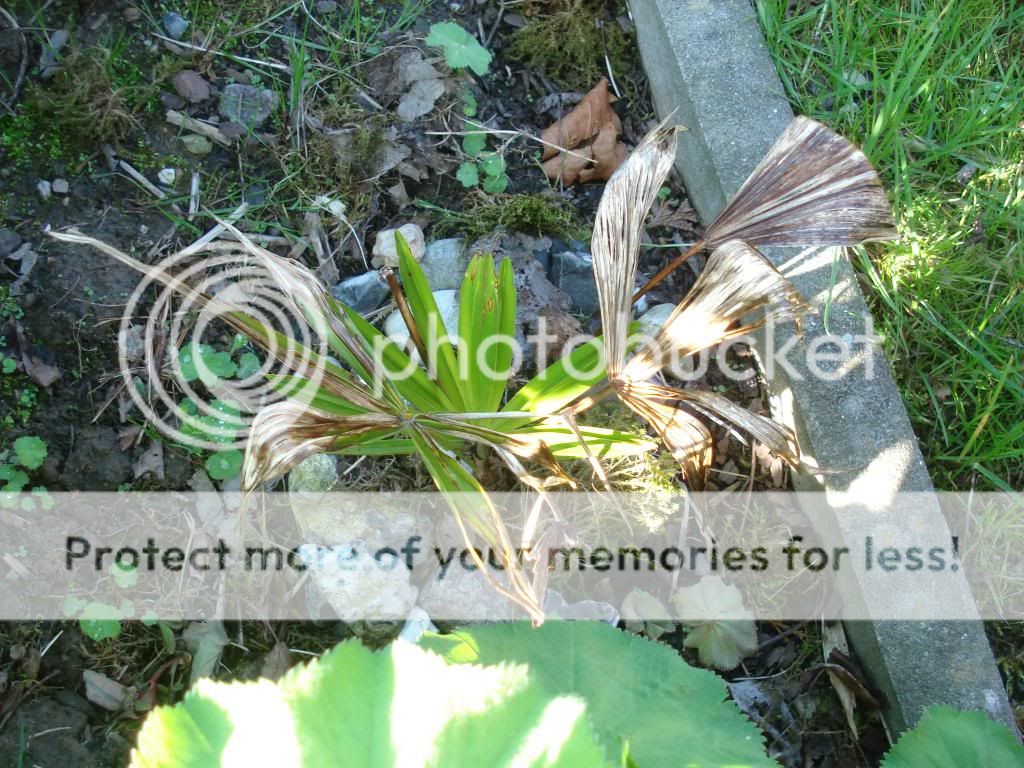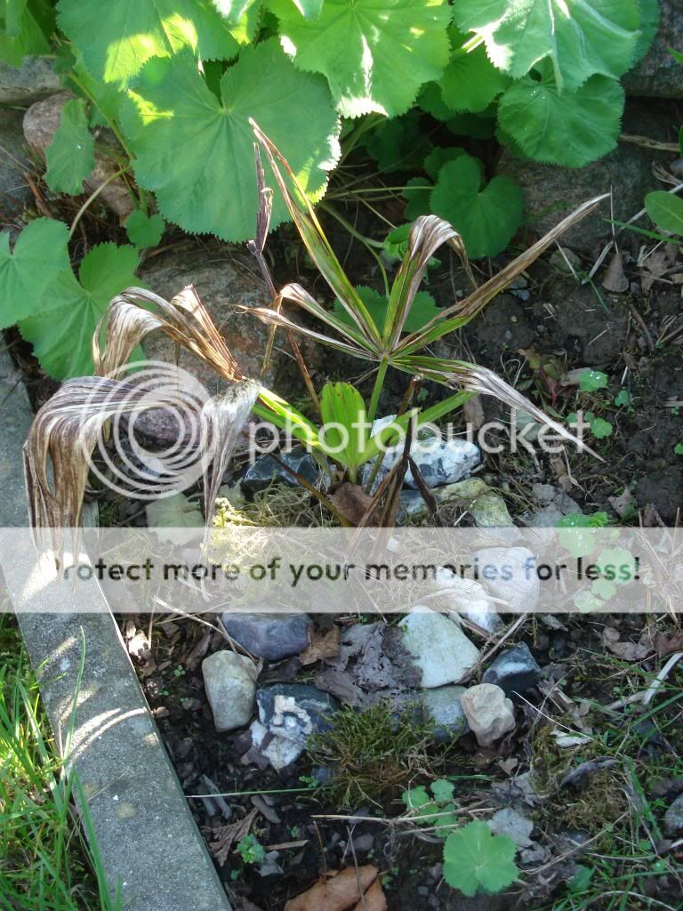 Ausgeplanzt wurde eine kleine Trachycarpus fortunei die er nur mit einem Eimer in den Laub gestopft wurde geschützt.