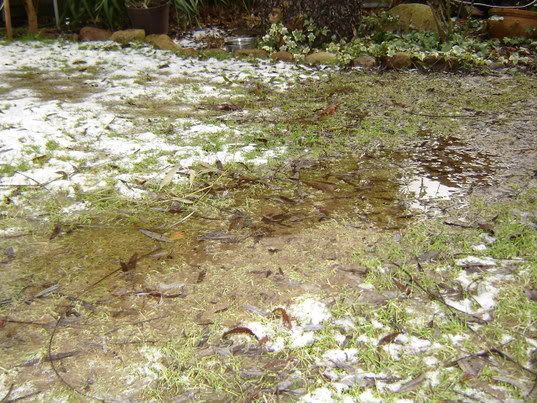 Nun musste ich feststellen, daß der Garten bei länger anhaltenden Regen zum Teil im Wasser steht. Es läuft ab, aber dieser Vorgang dauert sehr lange. Der gefallene Regen setzt einige Großflächen so unter Wasser, das sich zum Teil recht tiefe Pfützen gebildet haben.