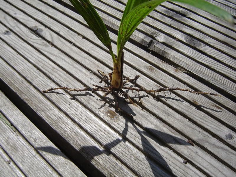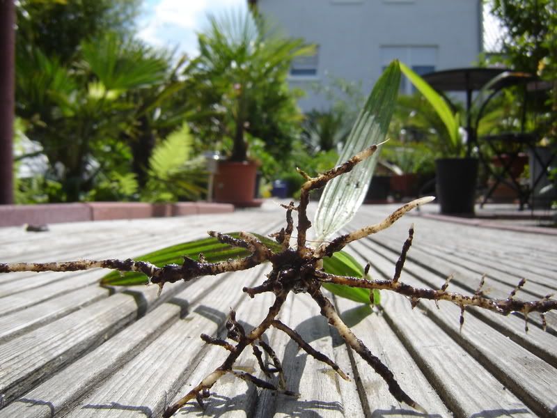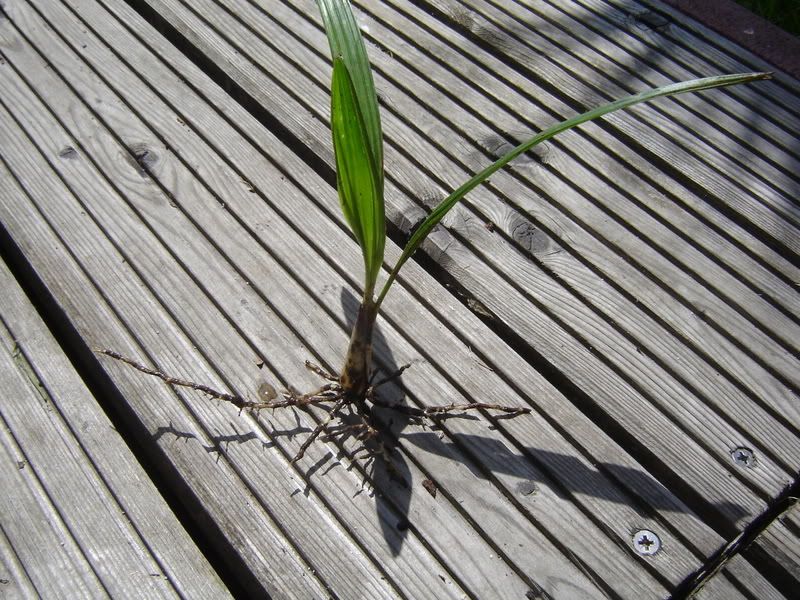 Diese 2 jährige Trachycarpus fortunei hatte ich, als ich einen Grasbüschel aus der Erde zog, mit in der Hand.