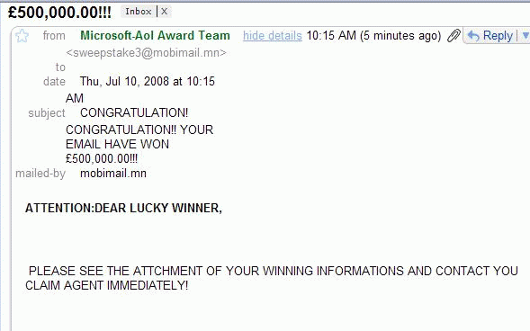 Terrible spelling, punctuation, syntax and grammar - Scammers apparently don't know how to use spell checkers. We assume they dropped out of school before that class. They use almost excessive and random CapItaLiZAtion. They often can't even spell "February" or know that "22th" ought to be "22nd". These scammers usually write at the 3rd grade level. Being non-native English speakers, they also often get first names and surnames (last names reversed), so you will frequently see names like "Mr. SMITH JAMES.", instead of "Mr. James Smith", along with the peculiar usage of periods (full stops) and spaces or the lack thereof. Real lotteries also proofread their emails and look and read more professional.