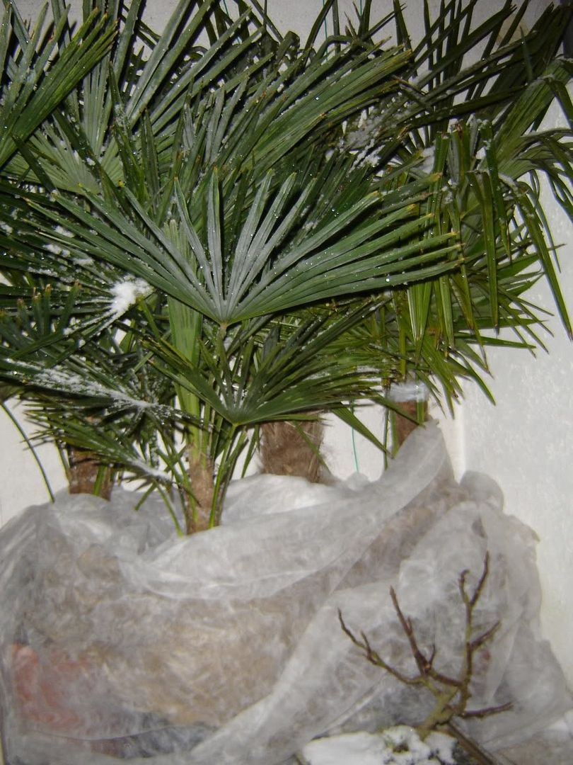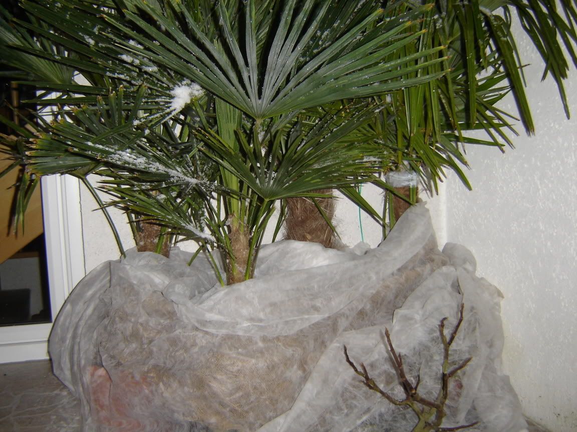 mir sind hier schon sehr viele Überwinterungsmölichkeiten für Freilandpalmen vorgestellt worden. Nun möchte ich euch meine für Kübelpflanzen zeigen. Hier stehen ganz nahe an der Hauswand Trachy, Jubaea und Rhapidophyllum wobei nur Trachy und Jubaea die Lufifolie brauchen. Hier bleiben sie stehen bis starker Dauerfrost angekündigt wird wobei sie aber erst nach dem dritten Tag ins Kalthaus gestellt werden sobald Frostabschwächung ist kommen sie aber gleich wieder raus. Dies ist übrigens eine Möglichkeit wie ich sie schon seit Jahren praktiziere Pflanzen die ich auspflanzen möchte