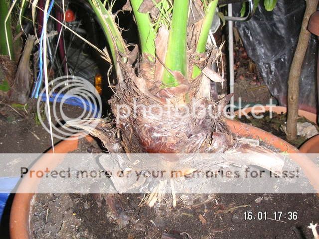 Im Herbst wurde sie mit den anderen Kübelpflanzen wie immer in den dunklen, frostfreien Keller eingeräumt. Als ich heute wieder nach meine Wintergästen schaute, mußte ich feststellen das der Stamm der Phönix auf einer Seite feucht war und sich die Reste der alten Wedel einfach entfernen ließen.