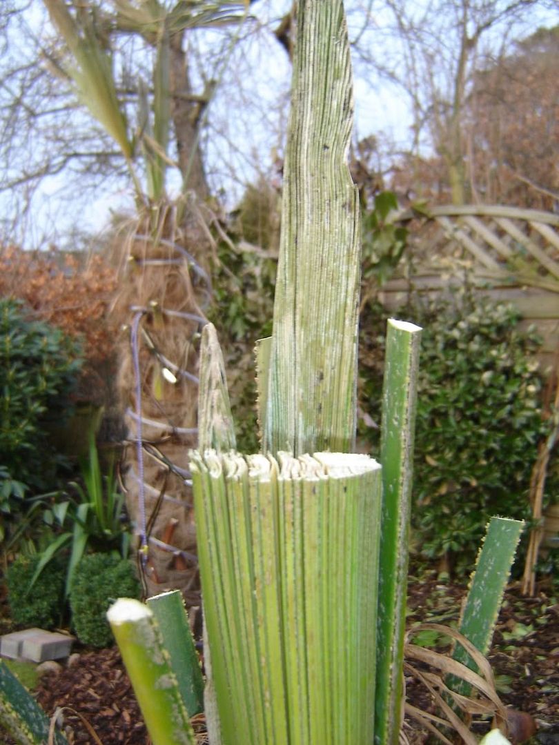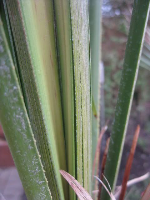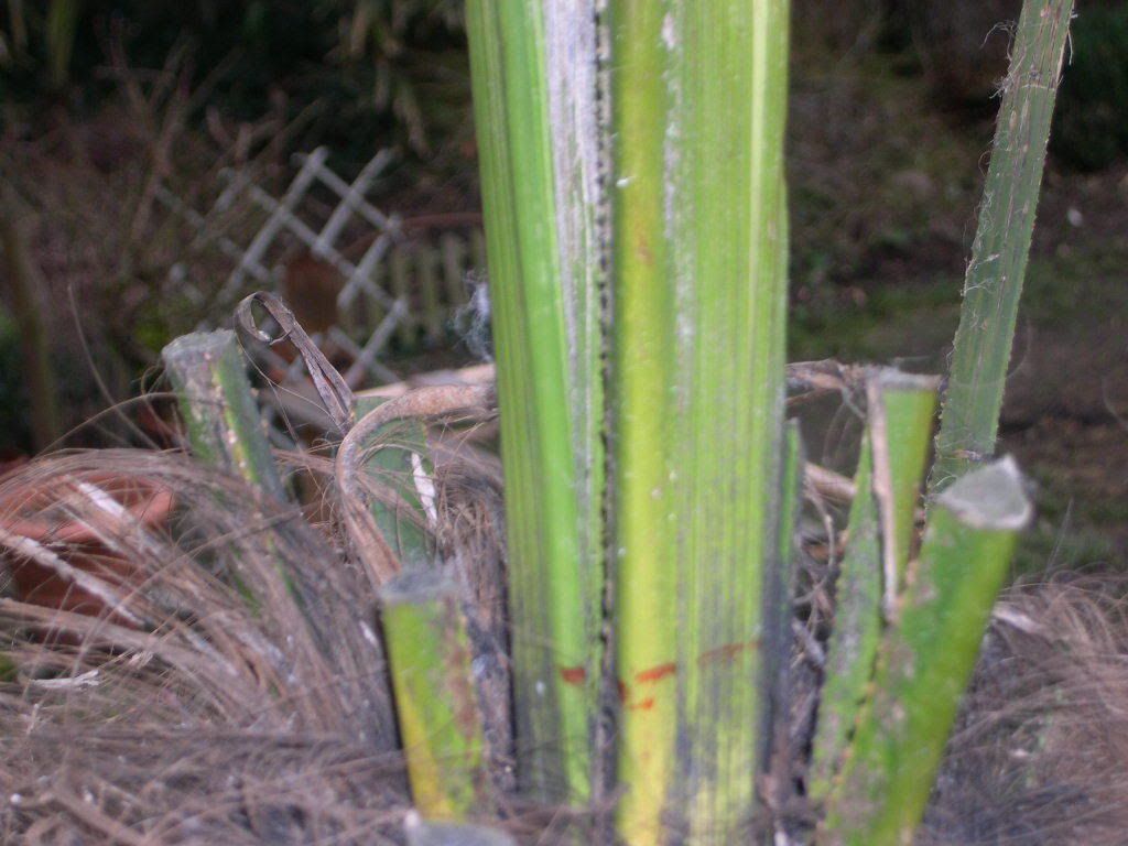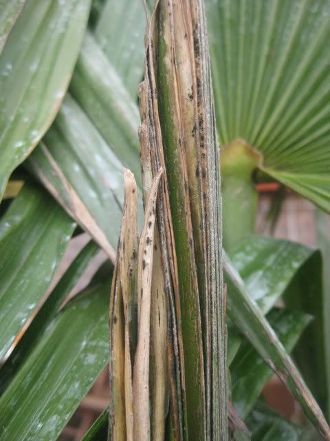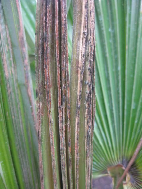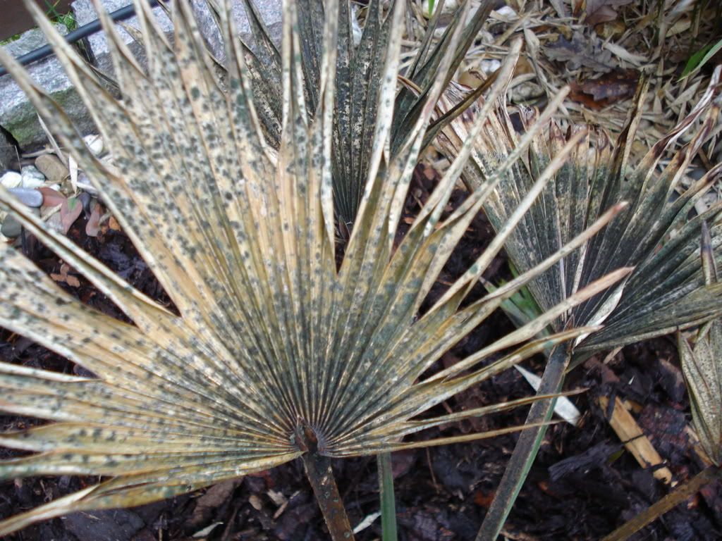 An meiner größten Trachy konnte ich bisher noch keinen Pilz erkennen. Bisher! Alle Fächer sind Pilzfrei, außer die Speere. An den Speeren zeigt sich ganz oben nun der Pilz. Habe gerade gespritzt.