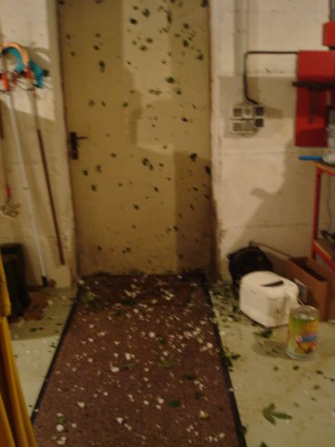 So hats nachher im Keller ausgesehen - die Tür hatten wir nicht zugemacht. Die Hagelbälle sind bis in den hinteren Kellerraum geschossen.