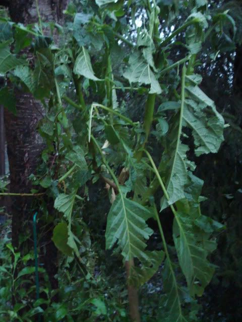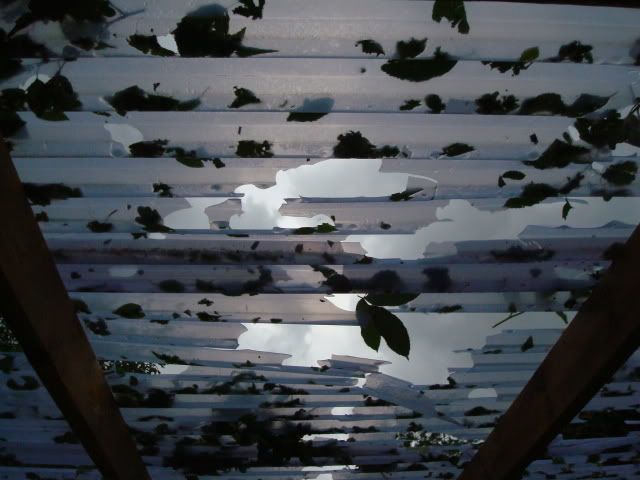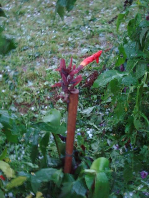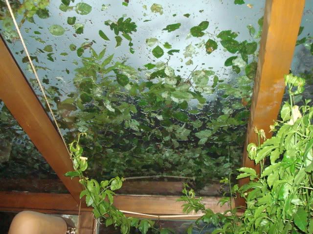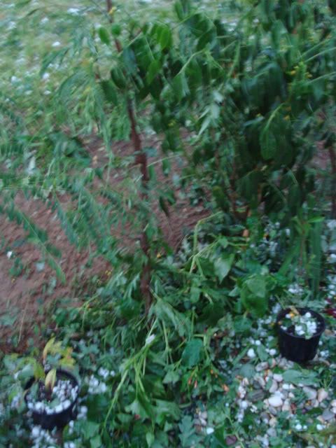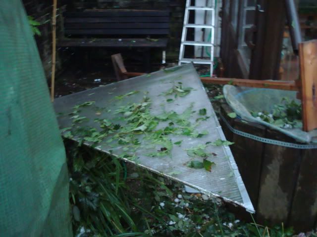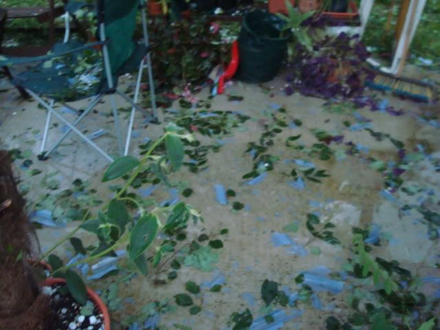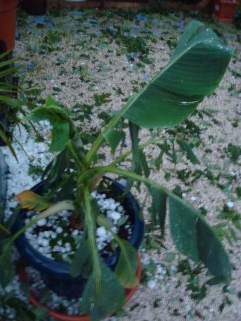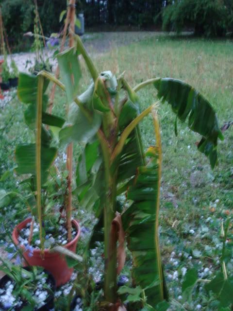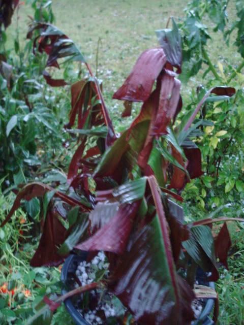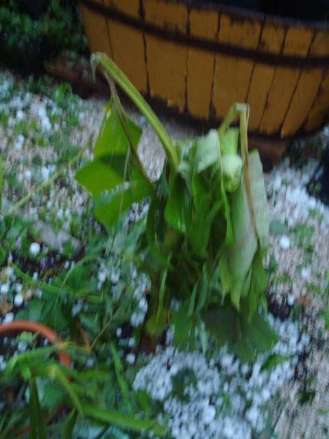 Die Musas, Cannas, Brugmansien - eigentlich alles, was große Blätter hat - ist Matsch - das Dach von den Carpörtern ist durchsiebt.