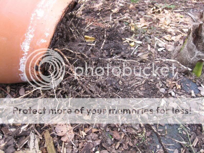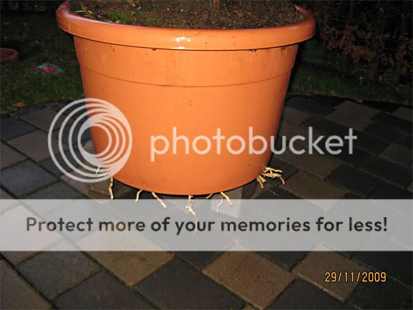 Der 60 Liter Kübel stand von Juni bis Heute ohne Untersetzter auf einer Mulchplane mit Rindenmulchabdeckung.