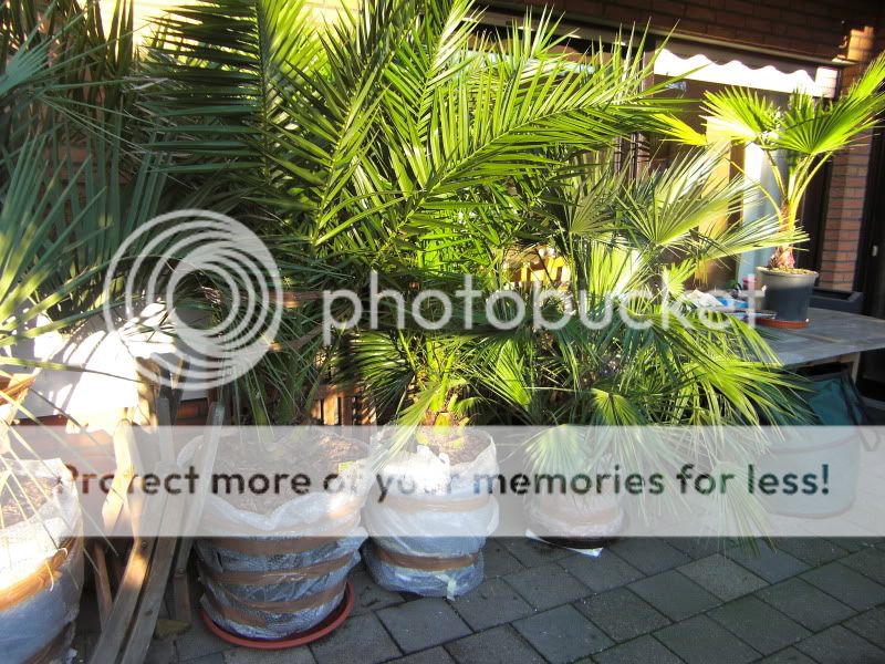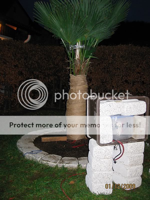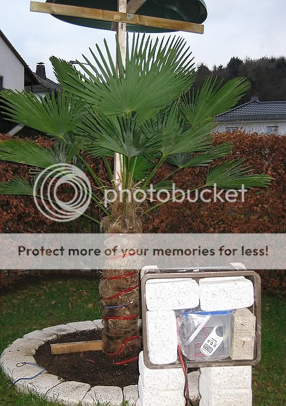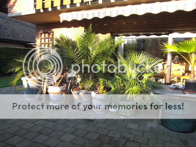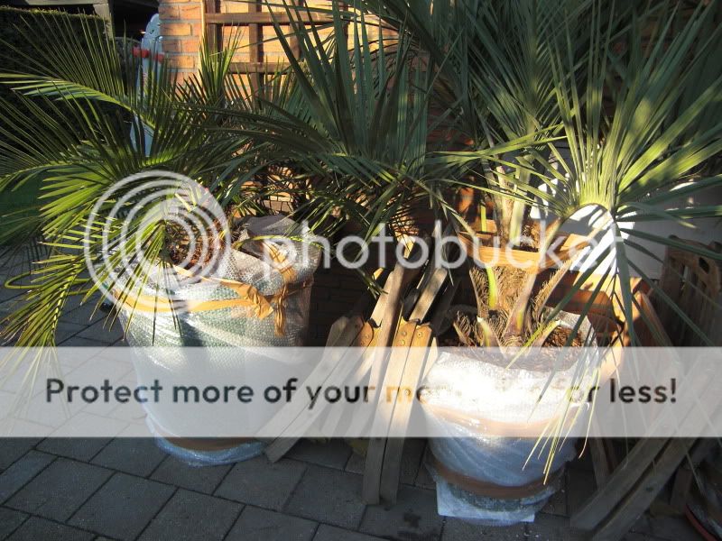Habe heute mal das gute Wetter genutzt um meine Topf- Palmen einzupacken. Lupo-Folie um den Topf, unter dem Topf Styropor und oben auf der Erde Rindenmulch.