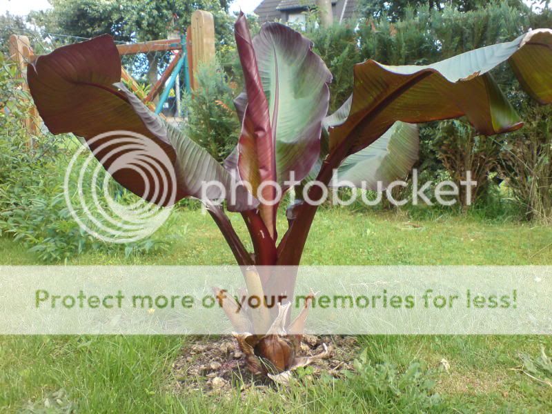 Die Bananen im Vordergrund im Topf ist eine Musa Yunnanensis, die eigentlich im Gewächshaus im Winter total abgestorben war. Jetzt treibt sie wieder! Auch diese hatte im Gewächshaus Bodenfrost und sehr feuchte kühle Nächte mitgemacht. Die Erde war viel zu feucht im Winter, doch sie hat es geschafft...