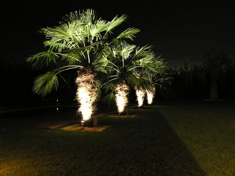 Die Palmen stehen, die Verkabelung war ja schon vorbereitet, nun der erste Eindruck in der Nacht. Wir hatten Besuch, und dank eines Gasschwammerls (Heizstrahler) war er Abend auch lang trotz der 12 Grad Außentemperaturen. Mit jedem Bier hat mir die Beleuchtung besser gefallen