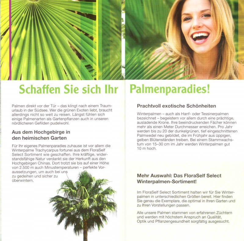 "Pro Jahr werden bis zu 20 der dunkelgrünen, tief eingeschnittenen Palmwedel neu gebildet, die im Frühjahr aus üppigen gelben Blütenständen treiben. *prust*