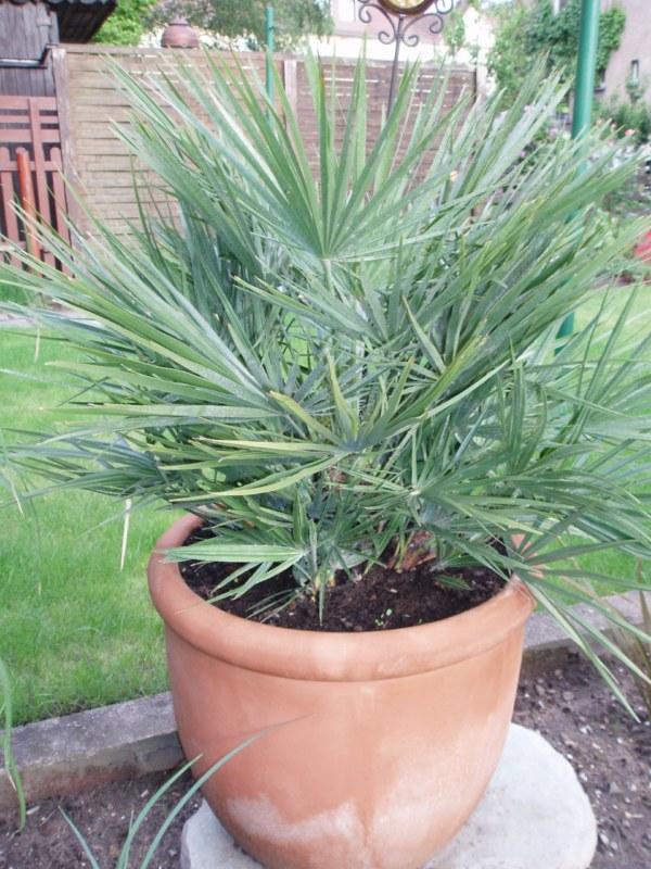 hab mal Fotos von meiner Zwergpalme ausgebuddelt.Hier einmal im Kübel: