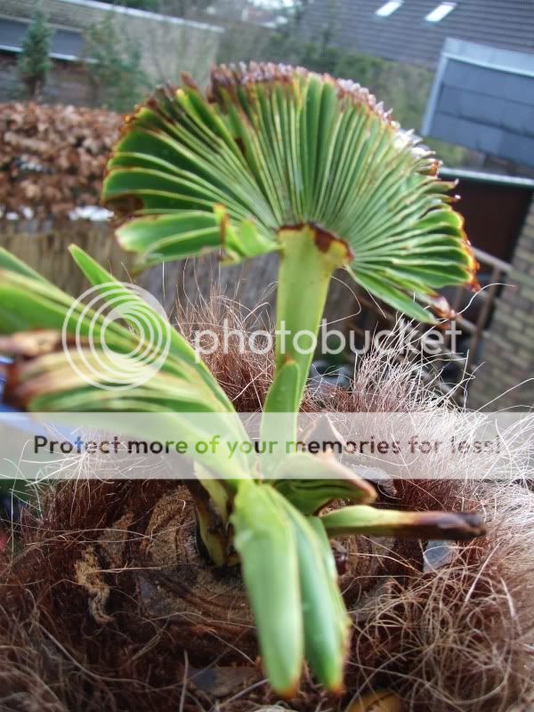 hatte schon mal geschrieben, daß die Cerifera ne Falschlieferung war. Sollte auch eine Brahea sein. Hab gleich gesehen, daß die bissel komisch aussah. Erst paar Tage später, habe ich mal überlegt was es sein könnte. Als ich den Stamm untersucht habe und unten am Ansatz einen Miniaustrieb sah, dachte ich sofort an die Humilis. Da kommt also schon ein 2. Stamm. Das hat man aber anfangs nicht gesehen, hatte doch den Topf gleich nach Lieferung komplett mit Styropor richtig zugedeckt und im Müllbeutel verschnürt. Die steht nun seit kurz vor Silvester auf der Terrasse.