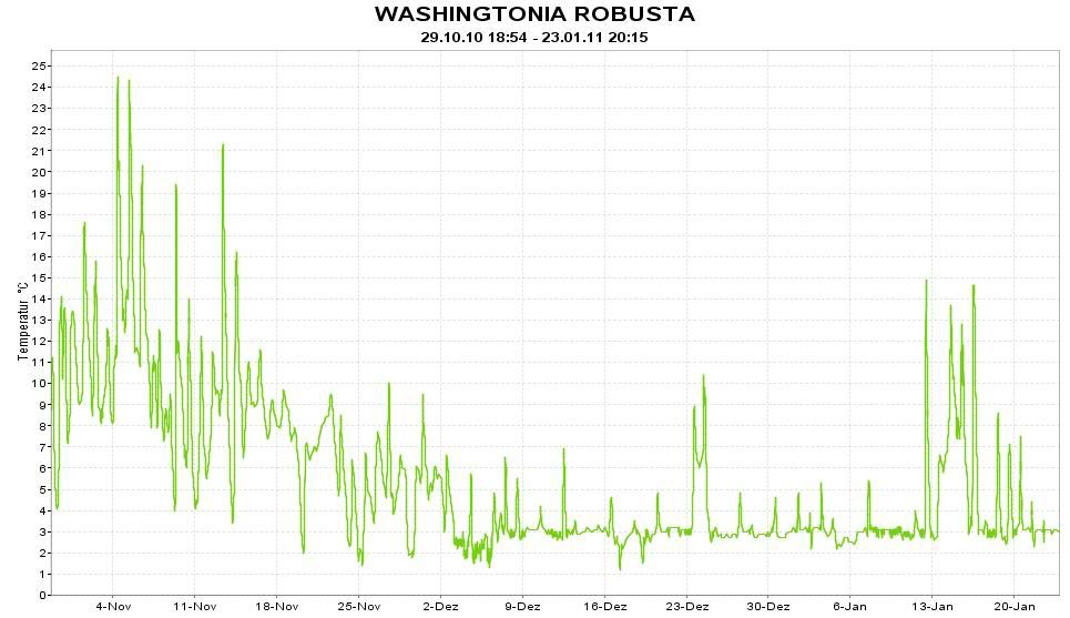 Meine Washingtonias stehen bei 3 - 6°C im Gewächshaus und werde fast gar nicht gegossen! Klar wird es jetzt wieder tagsüber bis zu 10°C und noch wärmer i Gewächshaus, aber die letzten 1, 5 Monate war es halt richtig kalt. Die untersten Blätter werden gelb, sterben jedoch nicht ab, erst wenn es dann richtig wärmer wird, kommt es zumabsterben. Die anderen Blätter bleiben saftig grün. Trocken, hell und eine sehr kühle Temperatur sind für eine Washingtonia die optimale Überwinterungsmethode bei uns. So hatte ich das auch letztes Jahr gemacht!