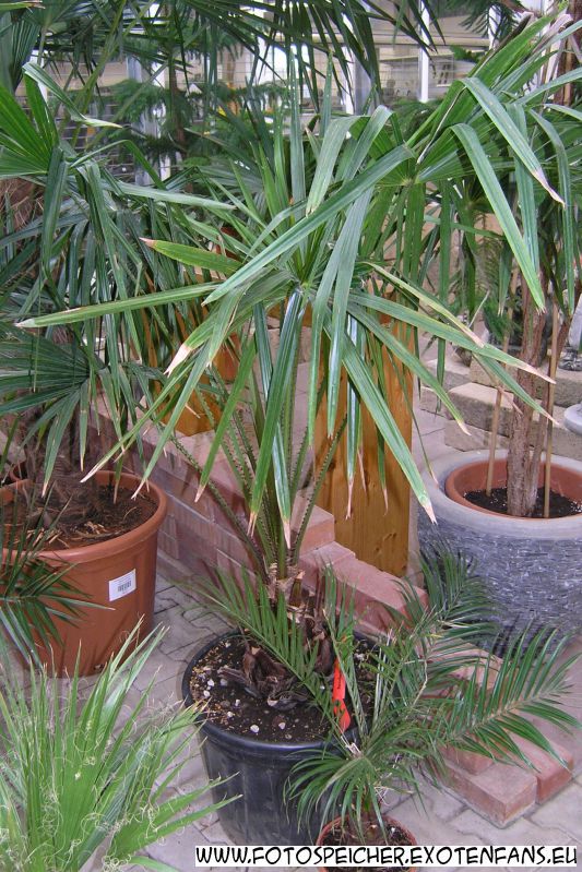 Sie hat ähnliche Blätter wie die Trachy etwas gedrungener und Haken an den Stielen wie Chamerops hummilis.