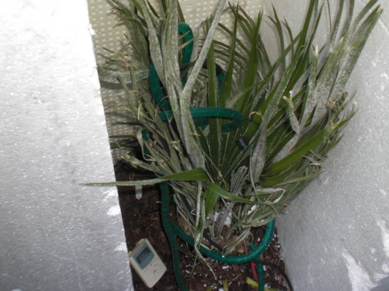 habe heute, bei herlichen Sonnenschein, Windstille und minus 8° meine Bauten kurz gelüftet und dabei festgestellt, das bei einer kleinen Trachy die Blätter zusammengefaltet sind. Also dachte ich mir, die braucht etwas Wasser (war immer ein Grablicht drin) und wollte das mit meinem "Prüfstab" kontrollieren.